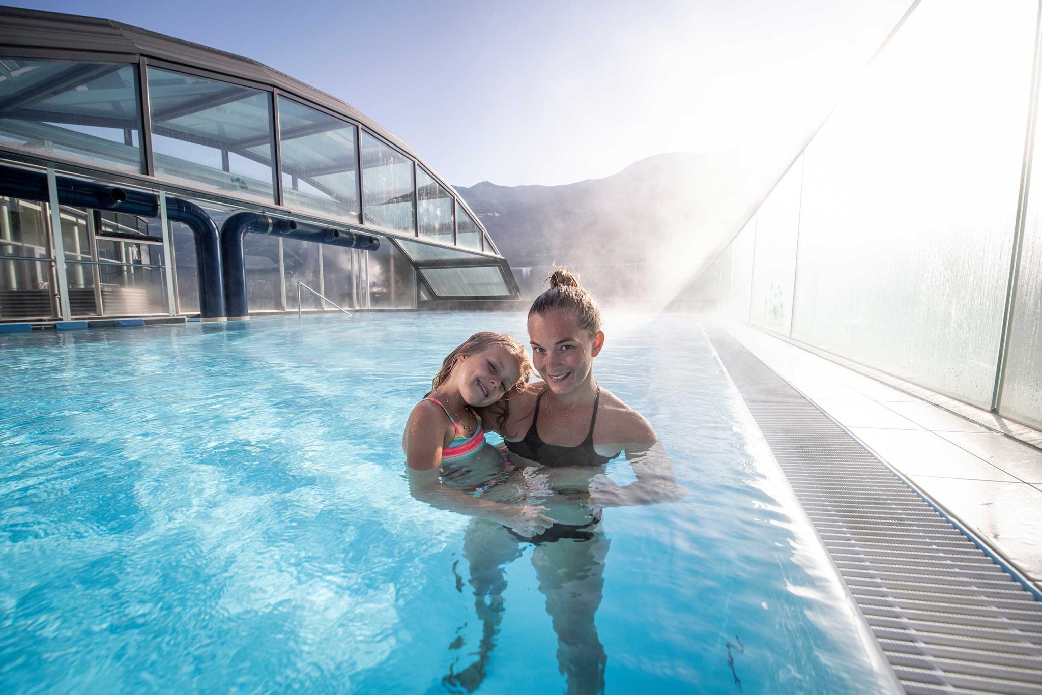 Die Erlebnistherme ist sehr beliebt bei unseren Gästen. Nach einem langen Skitag noch ein Sprung ins wohlige warme Thermenwasser oder schwitzen in der großzügigen Saunawelt. Mit den Indoor-Rutschen und Wasserspielen wird es auch den Kids nie langweilig.